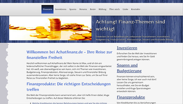 Sivusto achatfinanz.de keskittyy talousasioihin, kattaen laajan valikoiman aiheita, kuten sijoittaminen, budjetinhallinta, rahoitustuotteet, eläkejärjestelyt ja verotus. Alusta tarjoaa käyttäjille ajankohtaista tietoa ja hyödyllisiä vinkkejä, jotka edistävät taloudellista osaamista. Täältä löytyy suosituksia tehokkaaseen säästämiseen ja sijoittamiseen sekä strategioita tulevaisuuden suunnitteluun. Sivusto on suunnattu niille, jotka pyrkivät ymmärtämään talouden monimutkaisempia puolia ja tekemään tietoisia valintoja oman hyvinvointinsa hyväksi.