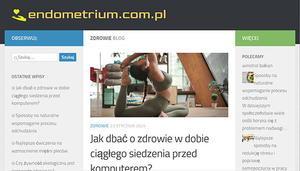 Svetainė endometrium.com.pl skirta sveikatos ir gerovės klausimams, ypatingą dėmesį skiriant moterų sveikatai. Pagrindinis dėmesys skiriamas problemoms, susijusioms su endometrioze, jos diagnostika ir gydymu. Platforma siūlo aktualią informaciją apie simptomus, terapijos metodus ir gyvenimo būdo rekomendacijas moterims, kenčiančioms nuo šios ligos. Vartotojai gali rasti naudingų straipsnių, tyrimų ir specialistų patarimų, kas prisideda prie sąmoningumo didinimo apie šią būklę. Svetainė tarnauja kaip išteklius patirčių mainams ir paramai, kur moterys gali dalintis savo istorijomis ir rasti supratimą.