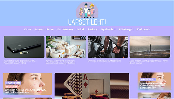 Сайт lapsetlehti.fi посвящен вопросам материнства, семейной жизни и благосостояния. Здесь обсуждаются темы, касающиеся воспитания детей, здоровья родителей и образа жизни. Особое внимание уделяется современным технологиям, включая игры и приложения для мобильных устройств, которые облегчают повседневные задачи. Публикуются статьи о важности личного времени для родителей и о том, как находить баланс между семейными обязанностями и собственными интересами. Сайт предлагает полезные советы и рекомендации, направленные на улучшение качества жизни и поддержание здорового образа жизни для всей семьи.