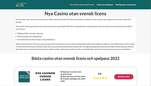 Сайт nyacasinoutansvensklicens.se посвящен новым онлайн-казино, которые работают без шведской лицензии. Здесь представлена информация о лучших игровых платформах, предлагающих разнообразные азартные игры. Пользователи смогут узнать о преимуществах таких казино, включая широкий выбор игр, привлекательные бонусы и отсутствие ограничений, связанных с шведским законодательством. Ресурс предлагает детальные обзоры, которые помогут игрокам сделать осознанный выбор и насладиться безопасным игровым процессом.